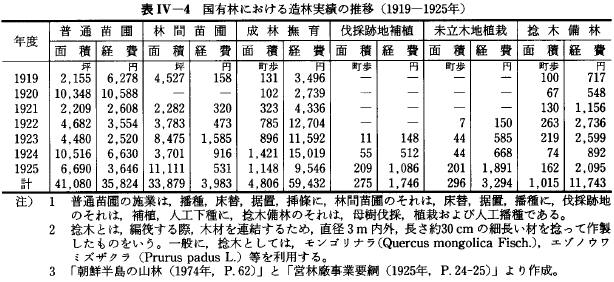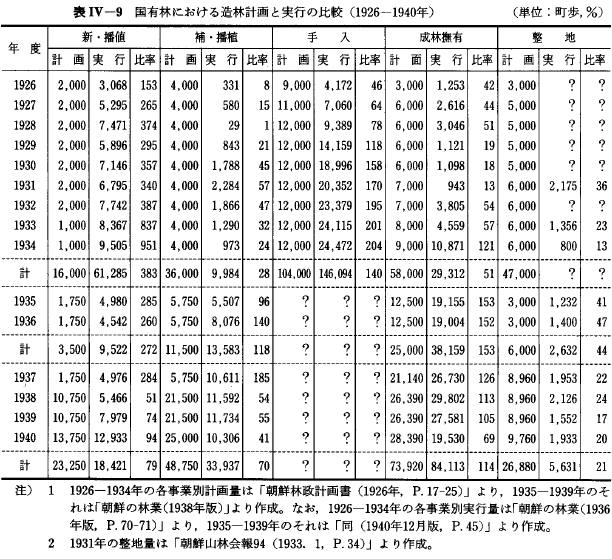 조림 면적 42, 000정보의 신식, 보식, 무육, 정지를, 또 미입목지, 산천의 조림 계획은 33, 100정보에 신식, 보식, 무육을, 그리고 제1, 11령급의 어린 연령숲은 27, 400정보의 성림무육을 이루어, 합계 102, 500정보의 조림 계획을 실시하려고 하는 것(이었)였지만, 그 실적은 전체적으로46%의 46, 754정보에 머무른 35).덧붙여 당시의 인건비의 상승과 재정의 악화등을 고려하면, 국유림의 조림 사업은 극히 부진하였다고 추측된다.