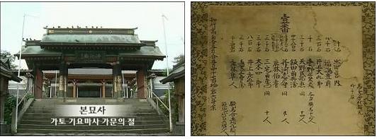 그렇게해서 남은 인물이 하라다 노부타네였다. 본묘사는 가토 기요마사가 전쟁 후, 자신의 아버지를 기리기 위해 지은 사당이다. 바로 이 절 안에, 가토 기요마사군대의 진립서가 보관되어 있다. 이 진립서는 가토 기요마사가 조선 출병 1년 전에 작성한 것으로, 조선침략시 출병할장수 들의 명단을 기록해 놓은 것이다.