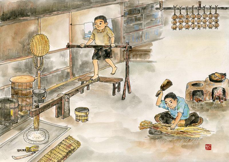自然に糠(ぬか)がはがれたので、今のように真っ白にならないけど、もみすりと精米が同時にできたんだよ。