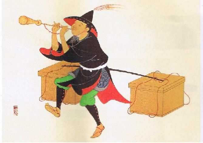 중국인  엿장사의 모습을 잘 보면, 그 많게는 중국인풍은 아니다.새의 새의 깃과 꽁지의 모자나 의상의 특징은, 오히려 조선 통신사의 그래서 있다.에도기를 통해서 일이회에 미치는 통신사의 일본 방문은, 쇄국하의 일본에 큰 문화적 영향을 내렸던 것이 알려져 있어 통신사의 의복을 본뜬 행사나 물건들은, 그 통과지에 머무르지 않고, 넓게 각지에 남는다.