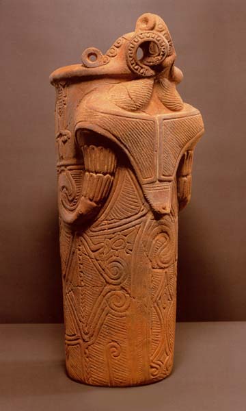상부에 뱀을 생각하게 하는 장식이 붙은 토기이지만, 각도를 바꾸는 것으로 여러가지 표정을 보이는 토기.