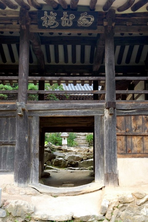 우화루(雨花樓)라는 현판이 걸린 길다란 樓마루가 긴 세월의 무게를 담으며 휘어져서 앞을 가로막은 모습을 보면 이 건축이 쉽사리 바깥 사람에게 그 내부를 열지 않는다는 것을 느끼게 된다. 폐쇄적인 외관에 내부로 통하는 통로는 작은 문 하나 뿐이다. 출입을 위한 樓마루 밑의 문은 높이가 성인 남성의 키보다 약간 낮아서 머리를 숙이지 않으면 들어갈 수가 없게 하였다. 따라서 시선은 樓마루 밑을 통과할 때까지 자연히 아래로 향하고 터널같은 문을 통과해 돌계단 앞에 와서 비로소 고개를 들면 급격히 밝아지면서 한 길 높이 위에 햇살 가득한 마당이 있다.