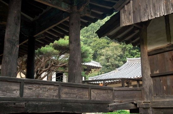 출입구인 우화루 아래에서 보면 신기하게도 눈길은 정면에 바로 보이는 응진전이 아니라 10시 방향 대각선으로 먼저 끌려든다. 중간마당의 구석에 있는 커다란 바위와 그 바위를 뚫고 자랐다는 소나무가 시각의 초점이 되기 때문이다. 보통은 묘한 긴장감이 느껴지는 이 대각선을 따라 무의식적으로 발길이 이곳으로 향한다. 이것은 의도된 구성으로 조경 효과는 물론 동선을 대각선으로 구성하여 좁은 공간이 더욱 확장되어 보이게 하기 위함이다.