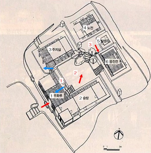 주지실(3번)은 툇마루 모퉁이가 樓마루와 붙어 있다. 그러고보면 마당을 둘러싼 툇마루들은 모두가 같은 레벨로 되어 서로 동위성을 유지하고 있다. 폐쇄적인 외관과 달리 마당 안에서는 건물 사이 사이의 열린 공간으로 끊임없이 외부의 풍경이 드나든다.(파란 화살표)  밖에서의 영산암이 단절과 축소였다면, 안에서의 영산암은 개방과 확장의 의미를 갖게 된 것이다.