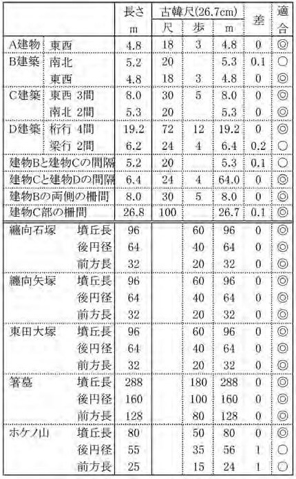 だから、いま気分が高揚している。一般の方にとっては、「古韓尺が使われていた」という事実の紹介だけで十分であろうが、やはりスペースを頂いて古韓尺の一致状況を別表に示しておきたい。