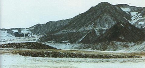 左: 日本の帆立貝式もしくは撥形前方後円墳の原型としての、深貴里99号墳の模式図です。満浦市の南方20kmの禿魯江の最上流に位置しています。全長12m、地勢が高い低丘北側から低い南側にかけて築かれ、南側の小さい方形部分には階段のように石を1ー2列築き上げています。南側部分は正面のように見えたといわれます。