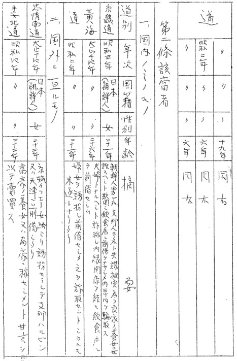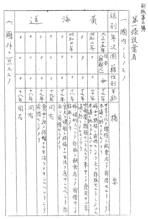 1927年 21歳 朝鮮人男1名支那人3名とともに共謀、被害者を良家の養女に世話すべしと欺罔し飲食店に前借なさしめ、うち30円を騙取す