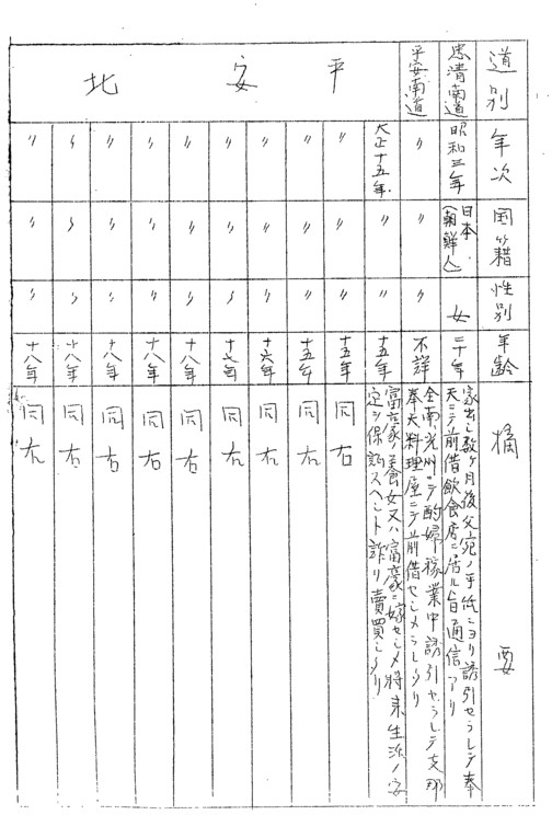 1927年 不詳 全南光州にて酌婦稼業中誘引せられて支那奉天料理屋にて前借せしめられたり