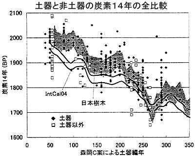 그러나, 야요이 시대에 해당하는 2400 년 이전 영역에서는 그래프가 평탄하게되는 부분이있어 교정 년대가 고유하게 정해지지 않는다. 탄소 14 년대 법에 의한 야요이 시대의 연대 특정은 위험하다. (2400 년 문제)