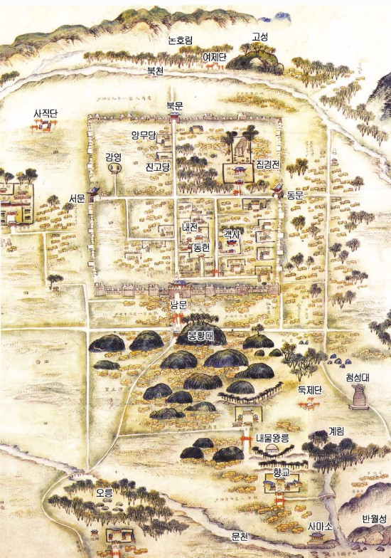 18세기의 지도. 읍성을 중심으로 고분, 첨성대 등 여러 유적이 표시되어 있다.