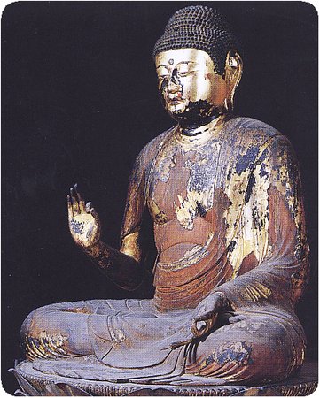 이것은 쿄토시의 한가운데에 있는 「긴 이야기당」의 아미타불 삼존상.헤이안 시대 말기의 작품으로 중요문화재.
