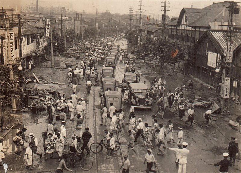 쇼와 13년 7월 코베대학 수해, 사망자 행방불명자 수백명의 참사였다.그 때의 혼란한 시내 풍경.순경이 교통 정리하고 있지만 차가 정체하고 있다.수몰 했는지요, 차를 밀고 있네요.장소 미상.
