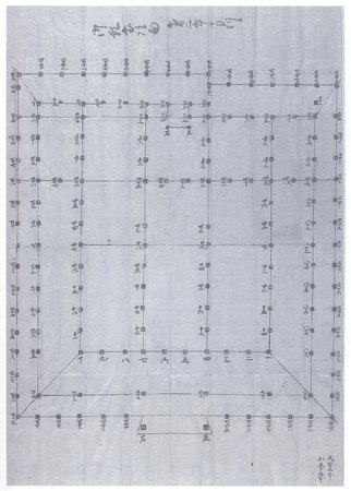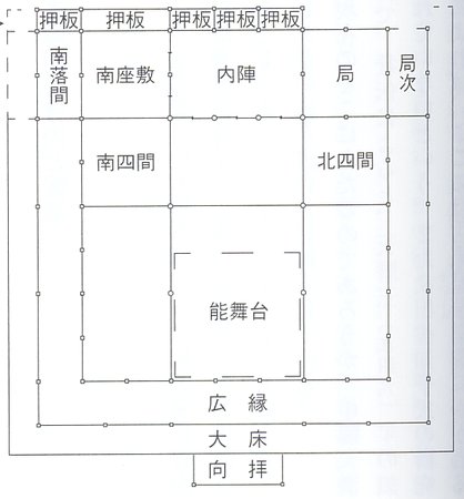 기록에 의하면, 이 건물에서 300명을 수용한 것 같다.이 평면도의 작자는, 1간의 넓이를 종래의 6자로부터 쿄토풍의 6자 5치수로 확대했다고 상정하고 있다.