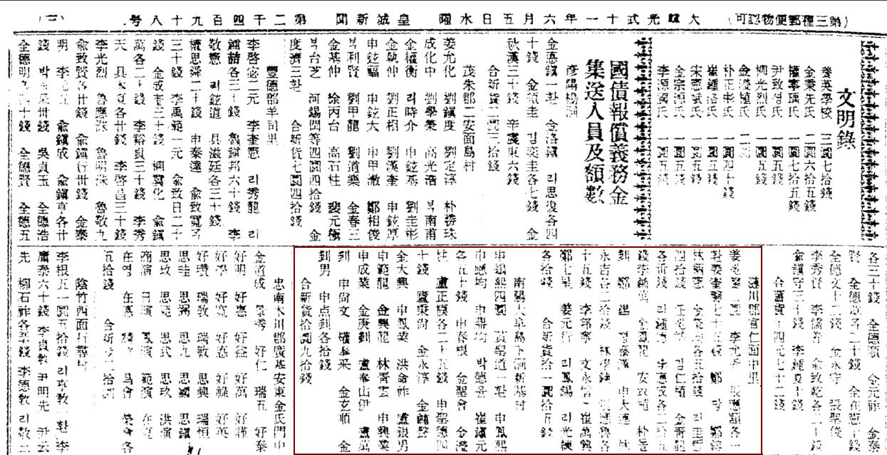 忠州だね警務で罪囚たちは  草履を三考  溜めたお金 6ウォン 60銭を大韓毎日新報に送ったし