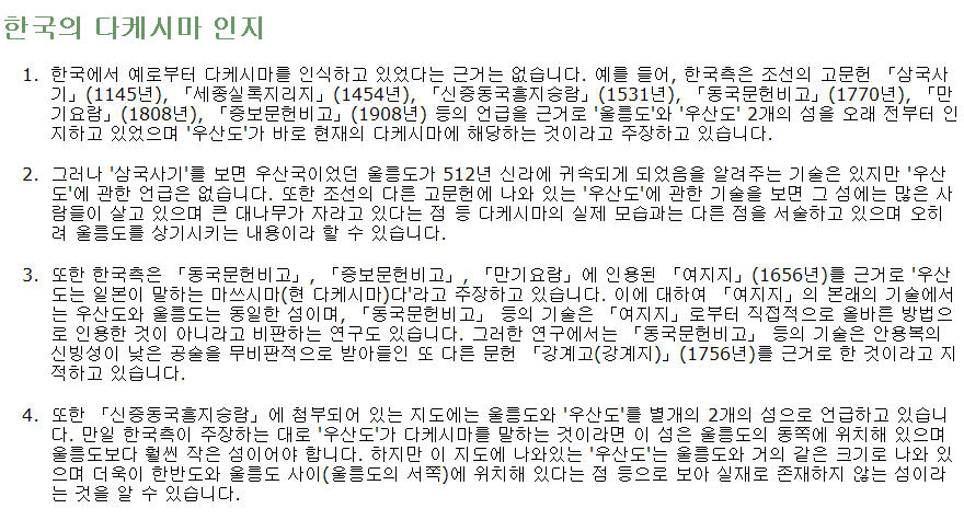 반면 한국 국민들의 주장은 (註釋:한국정부는 一考의 價値도 없기 때문에 no comment라는 입장),
