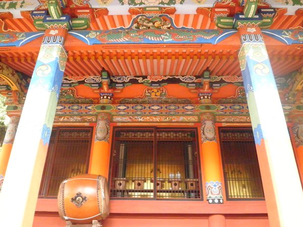 2つの摂社本殿の板壁に描かれた絵。外面に絵が描かれた建築は多くないので、やはりインパクトは強い(韓国では土壁に絵を描いている建築を結構見た)。