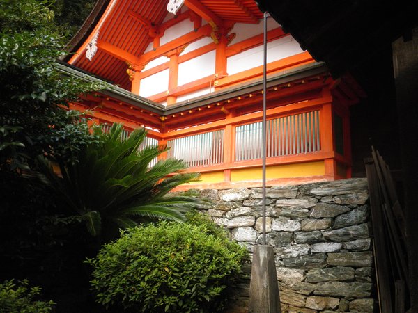기슈의 세이세키로 불리는 녹색편암의 돌담 위에 서는 본전.청록 같은 돌의 색과 선명한 주홍색의 편성이 아름답다.