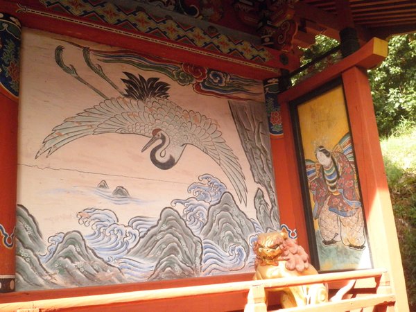 2개의 섭사 본전의 판자 벽에 그려진 그림.외면에 그림이 그려진 건축은 많지 않기 때문에, 역시 임펙트는 강하다(한국에서는 토담에 그림을 그리고 있는 건축을 상당히 보았다).