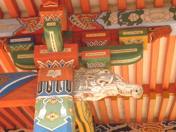 헌형과 처량이 선염 채색의 운문, 공포 부분은 역선염의 조대문, 내법 중인방이 뾰족한 타원형을 이어맞춘 무늬.