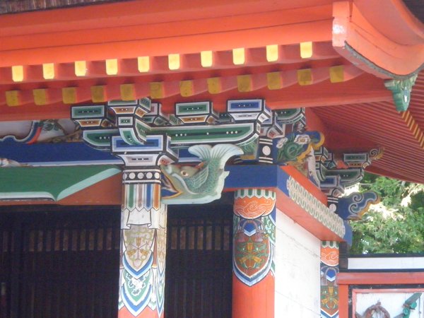 와카노우라 텐만궁과 달라, 미후네 신사 신전은 아름답다고 생각했다.매우 화려하지만, 그것은 채색이나 화려한 그림으로부터 오는 감각이다.어디까지나 채색이 메인에서, 조각은 서브에 지나지 않는다(와카노우라 텐만궁 본전붙은 감각은, 지금 생각하면 판지륜의 부조에 있던 것은 아닌가.저것이라면 보통 지륜이 훨씬 좋다).