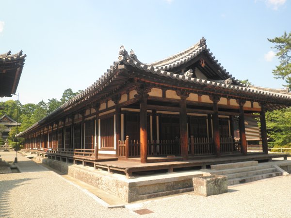 正面9間・側面6間の大きな建物で、縦線横線がとにかく目立つ。組物は簡素な大斗肘木。外周りの肘木に絵様を施し、頭貫先端には拳鼻を付けるが、装飾らしい装飾はその程度。薬師寺の金堂だったわりには簡素な印象だ。