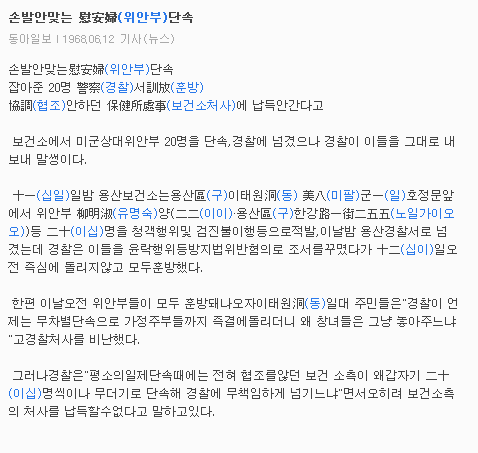 기사 내용은 미국 8군대 앞 위안부행위를 벌인 20명의 여자를 체포 했지만