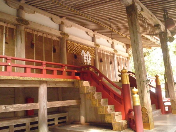 白木と金色の飾り金具、そして朱塗りの高欄。シンプルな装飾が良い。