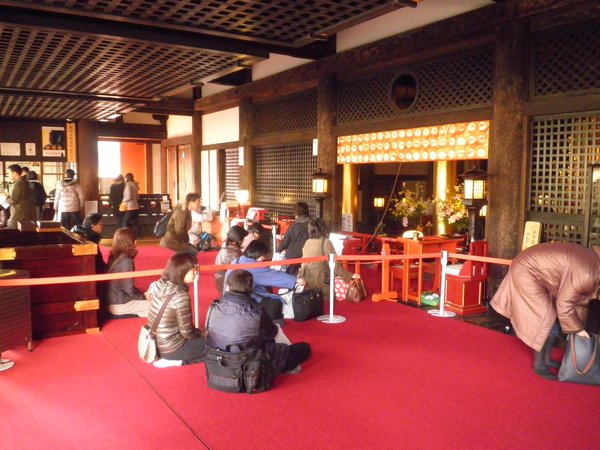 로쿠하라꿀테라모토당내부.12년에 1도의 개장답게, 많은 참배객이 방문하고 있었다.십일면관음의 손에는 실이 감겨지고 있고, 그 실은 Gejin에까지 달하고 있다.참배객은 불상과 대면해, 그 실의 첨단을 잡는 것이다.