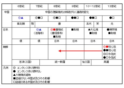 우에에 끌어들인 그의 주장 가운데, 만일 굵은 글씨로 한 곳(점)이 사실로, 그가 만든 표와 같이 7 세기, 8 세기의 중국과 8 세기의 일본에 술병기둥을 확인할 수 있는지, 어느 추정할 수 있다면--술병기둥 혹은 옛 식의 몸통 붙은 전파 경로가 당→통일 신라→고려라고 하는 루트로, 별로 나도 이존은 없는 것이다. 그러나 나라시대의 연호 건축으로 보여지는 것은 긴