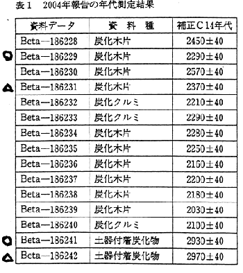 また、Beta186242とBeta-186231(△印)も同一生活面の資料だが、土器付着炭化物のほうが、600年古く出ている。
