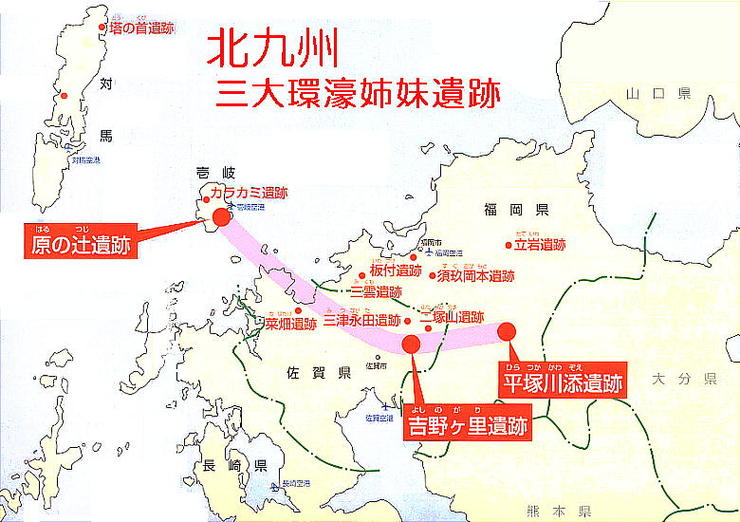 야요이 시대, 有明海沿岸을 중심으로 한 筑紫平野에는, 많은 부락이 있고, 이윽고 유력한 집단을 중심으로, 몇개의 부락을 정리한 나라가 태어나 갔다.吉野ヶ里遺跡은 이러한 나라의 하나로 생각되고 있다.吉野ヶ里遺跡의 취락은, 주위를 호로 둘러싼 환호 집락에서, 그 규모는 弥生中期後半(전 1 세기 후반)에 가장 커진다.취락이 있는 언덕 전체를 넣듯이, 총연장 2.5 km의 濠가 파지고, 적의 침입을 방지하는 土塁나 逆茂木을 하고 있다.그 면적은 약 40 ha, 코시엔 구장의 거의 10배의 크기에 해당한다.그 후도 이중 이상의 환호를 하고 방어를 굳힌 취락이 만들어져 엄중하게 지켜질 수 있던 호의 안쪽에서는 수혈 주거자취나 고마루 창고자취외, 유력자가 「축제마다(정치나 제사(제사장) 등)」를 행하고 있었다고 생각할 수 있는 고마루식의 건물자취, 호의 사방으로는 파수를 위한 망루라고 생각되는 건물자취도 발견되고 있다.이러한 발견은 중국의 사서에 그려진, 왜인(→야마토)의 나라의 모습을 방불시키는 것으로서 주목받았다.유적에서는, 큰 토기에 사체를 매장한 옹관이 2000기이상 발견되어 안에는 수백기의 옹관을 열상으로 매장한 공동묘지도 있다.옹관에서는, 칼 상처가 나거나 두골이 없는 것 등, 싸움에 의한 희생자라고 생각되는 인골도 발견되고 있다.한편, 많은 사람들을 매장한 공동묘지에서는 익숙해 지고, 유적의 남북 2개소에서는 분구묘가 발견되고 있다.남북 46 m, 동서 27 m, 높이 추정 4.5 m의 장방형을 한 북쪽의 분구묘에는, 14기의 옹관을 낳을 수 있어서, 墳丘中央部의 옹관에는 한반도제의 동검이나 유리제관옥등을 거둘 수 있었다.