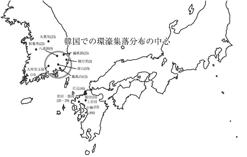 との関係が存在した公算が強い、という見解もあるが[寺沢1999]、石器や土器など総合的な文化的所産から考えて、直接的な祖形としては韓国南部地域を源流とするのが妥当であろう。原三国時代の環濠も含めると韓国では20 ~ 30遺跡の環濠集落が検出されている。そのうち、集落構造の把握が可能な無紋土器時代の環濠集落は芳基里遺跡、八達洞遺跡、南山遺跡などが挙げられよう。日本列島の最も古い板付遺跡の環濠と比較してみると、韓国では大栗里遺跡のように比較的古い環濠集落が清原で見つかっているが、環濠集落の大部分は蔚山(芳基里、検丹里)、大邸(八達洞)、昌原(南山)、晋州(大坪里玉房)などの嶺南地方、かつて慶尚道と呼ばれていた半島南東部に集中している。立地条件も丘陵上に立