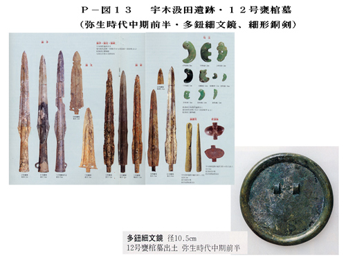 多鈕細文鏡や青銅武器、玉類を副葬する墓は、飯盛高木遺跡のほか唐津市宇木汲田遺跡甕棺墓(P-図13)、下関市梶栗浜遺跡箱式石棺墓に限られ、東方への波及は大阪府柏原市大県遺跡と奈良県御所市長柄で多鈕細文鏡が出土しているが、長柄の場合は銅鐸と一緒に出土しており、九州北部の副葬鏡とは明らかに性格が異なっている。」