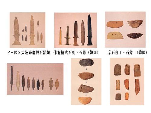 부산시 동삼동 패총에서는, 조선계의 즐문토기와 큐슈 북서부계 죠몽 토기가 전기부터 후기에 걸쳐서 공존한다(P-도 1).죠몽 전기의 증전식 토기는 기하학적 문양이나 태토에 활석가루를 혼입하는 등, 즐목문토기와 공통되는 요소를 볼 수 있어 그 영향이 지적된다.죠몽 만기에는, 한반도 남부로부터 벼농사 문화를 가진 집단이 현해탄 연안에 도래했다.벼농사와 함께 큐슈 북부에 들어간 문화는, 마제의 유 무늬식석검・돌살촉・돌도끼 등 대륙계 마제 석기(P-도 2), 목제 농구, 방직, 금속기, 지석묘(P-도 3)등이 있어, 모두 한반도의 무문 토기 문화에 속하고 있다.또 토기는, 무문 토기의 직접적 영향으로, 그것까지 없었던 항아리(P-도 4)가 출현해, 옹이나 음식을 담는 굽달린 그릇등의 기종의 양식이 정해져 간다.3월 말부터 중기 초두의 큐슈 북부의 옹관묘(P-도 5)나 토광묘(목관)에는, 조선제의 다유세문경(P-도 6)이나 청동 이기(剣・矛・弋 P-도 7)가 부장 되어 이것에 조선계의 천하석제의 곡옥이나 죠몽계의 비취 곡옥이 더해진다.경・검・옥세트로 부장 하는 삼종신기의 원형은, 도래 집단이 가져온 장송 의례에서 구해진다.