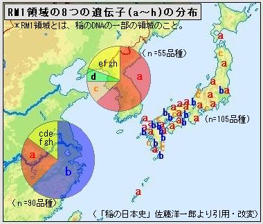 佐藤가, 오사카의池上曽根遺跡이나 나라의 唐古・鍵遺跡으로부터 출토한, 2,200년 이상 전의 야요이 미의 DNA 분석을 행했는데, 한반도에는 존재하지 않는 중국 고유의 볍씨 품종이 섞여 있는 것을 알 수 있었다고 한다.  사토에 의하면, 벼의 DNA의 문자(염기) 열이 유용한 유전자를 의미하지 않고, 무의미하게 반복하는 영역, 이른바 SSR(Simple Sequence Repeat) 영역 가운데, RM1라고 하는 장소에 a~h의 8 종류(다형)가 있다고 한다.