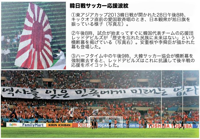 日本のサポーターは試合前、日本帝国主義を象徴する旭日旗を3分間ほど振った。大韓サッカー協会が措置を取り、保安要員が旭日旗を取り上げた後からは日章旗を振った。