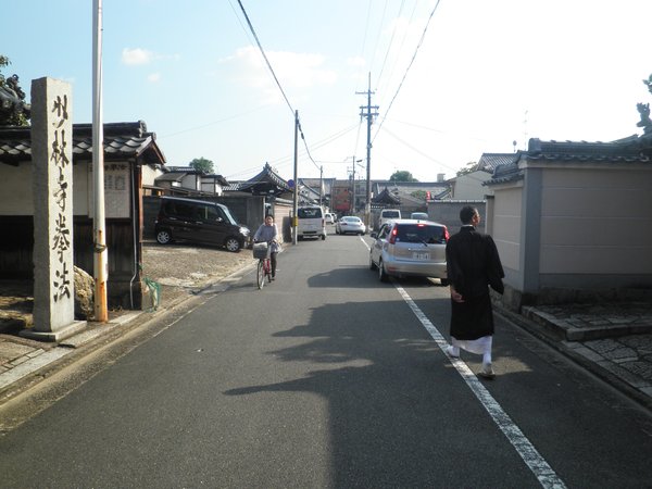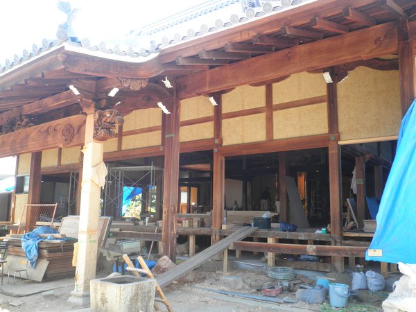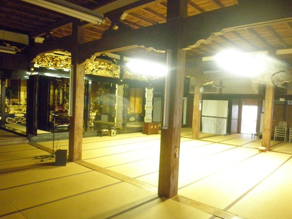 明尊寺本堂は、只今工事中だった。この建物は資料が多く残っているそうだが、それによれば、建立は1614年に遡り、その時は妻入で桁行5.5間、梁行3.5間、四方にShikoro庇を付けていたそうだ。それが1696年の改築で、妻入りはそのままとして、桁行6間、梁行3間、梁行方向のShikoro庇が1.5間に改められた。これは1668年令の影響だろう(実際、真宗本山は1668年に建築規制を含む掟状を全国の末寺に向けて出している)。