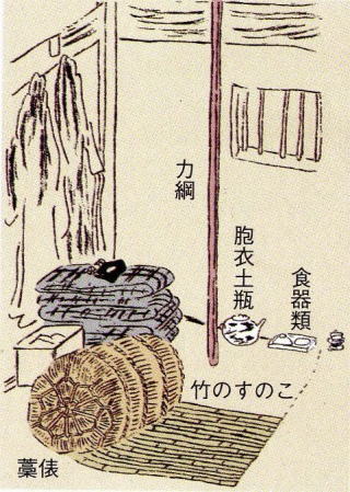 産屋は、1~2間四方の広さで出産時に握りしめる力綱が下げられ、座産のときによりかかる「わらだわら」、胎盤を入れる胞衣土瓶がおかれました。