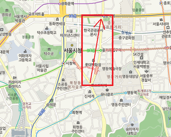 (북창동 언덕에서 북쪽 종로의 보신각 방향을 향해 찍은 사진)