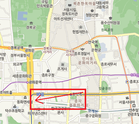 写真に取れた区域がすぐ鐘路大道(大路)と鍾樓北にあたる.