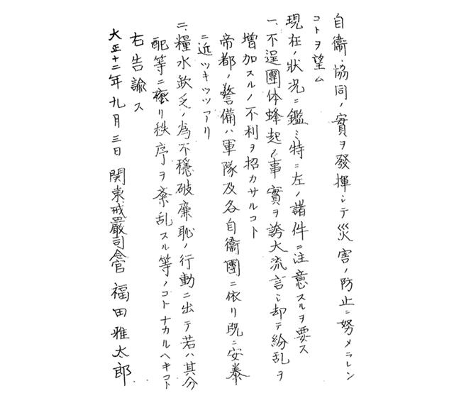 本職隷下の軍隊及諸機関(在京部隊の外、各地方より招致せられたるもの)は、全力を盡して警備、救護、救恤に従事しつつあるも、此際地方諸団隊及一般人士も亦極力自衛、協同の実を発揮して、災害の防止に努められんことを望む。