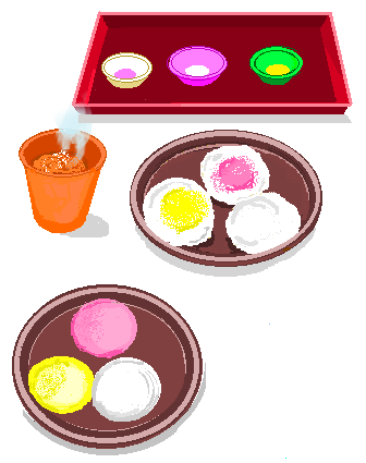 もち米粉をイエロー色桃色白で染めて堅くイックバンズックする