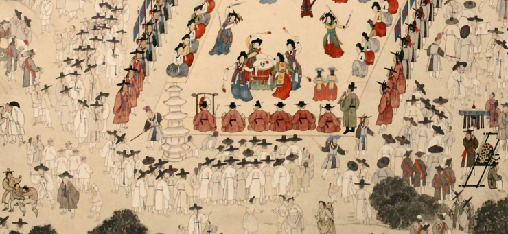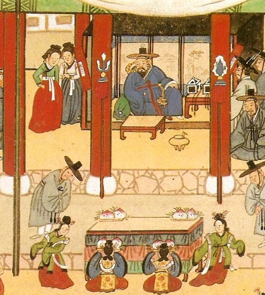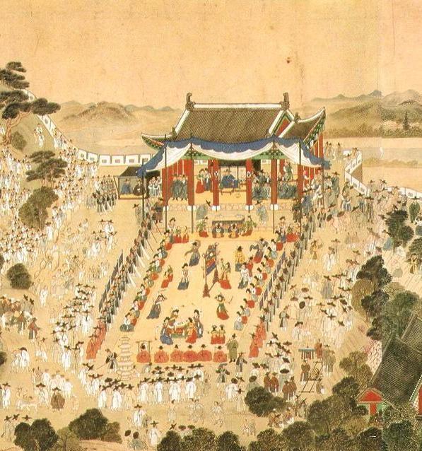 악사이고 양쪽으로 길게 앉은 여인들은 기녀이며 기녀 뒤에는 호위무사들이 있다