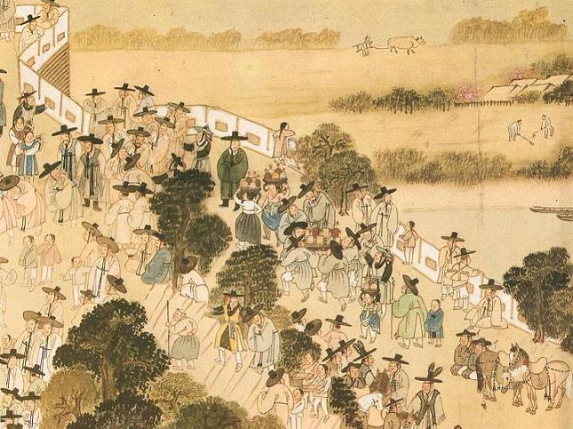 장막을 친 왼쪽으로 할머니 할아버지 아이 아주머니 등 연회를 구경하러 나온 마을 사람들로
