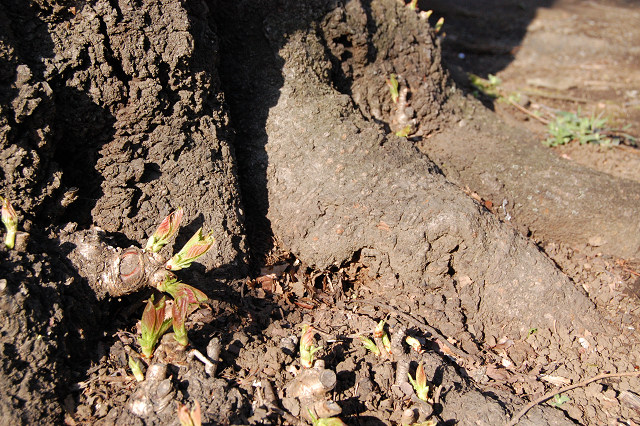 桜の木の根元をを見ると、こんな所からも芽が出ていました。