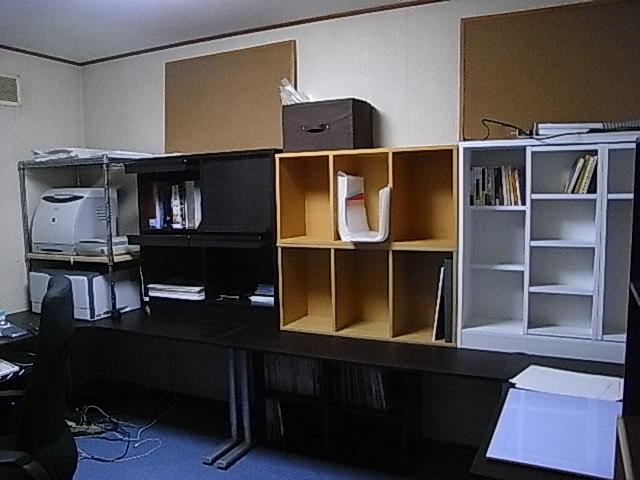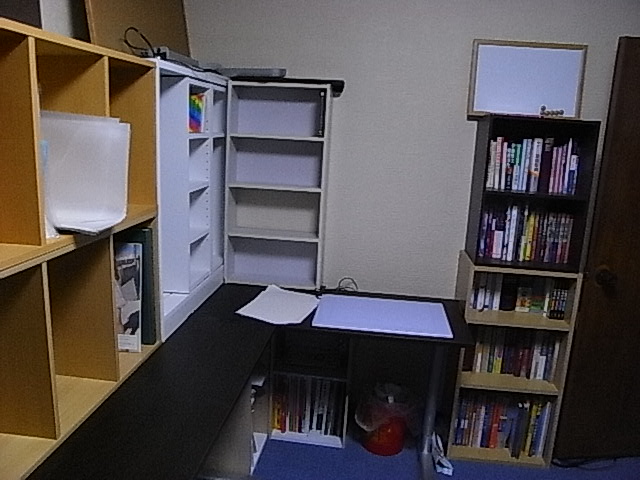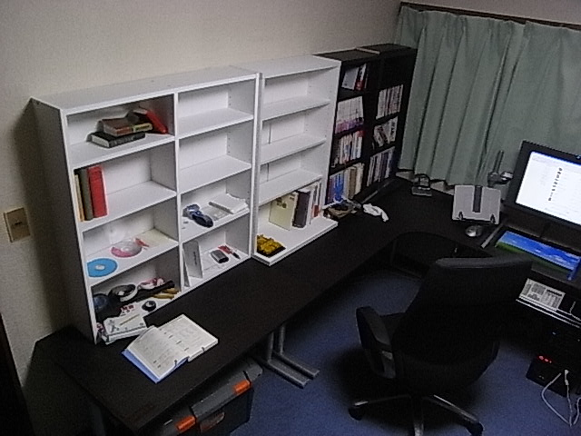 창가는 만화책선반.한가운데는 자료책을 두는 예정.작은 책은 탁상의 책장, 큰 책은 안하의 칼라 박스에.좌측은, 현재 어학 독습 때의 공부책상이 되어 있습니다.