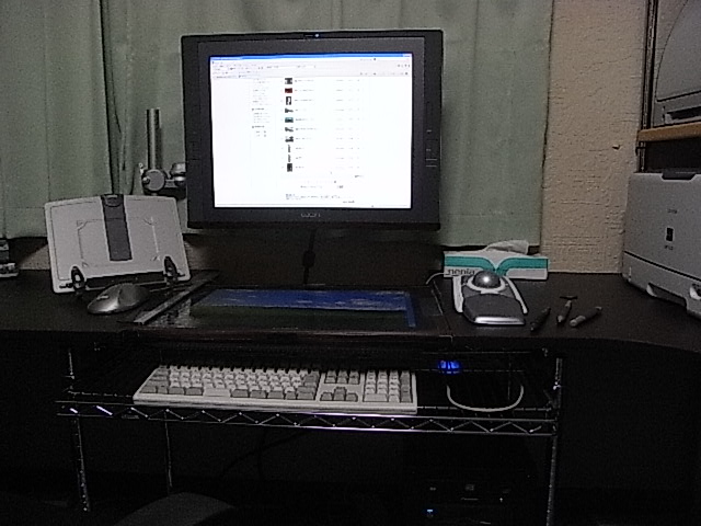 正面に見えるのはライトトレスボックス。その奥、机の壁側は5cmくらい削りとってあり、消しゴムの滓をゴミ箱に落とすことが出来る予¥定。(クリアファイルを貼¥り合わせて、ダストシュートへの導入部を作って、下に四角いゴミ箱を配置する)