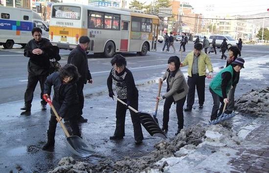 일본은 제설차량과 제설기계로 전문가가 전문적으로 제설 작업을 한다.