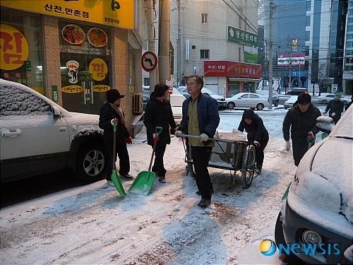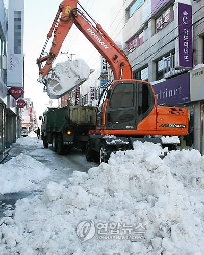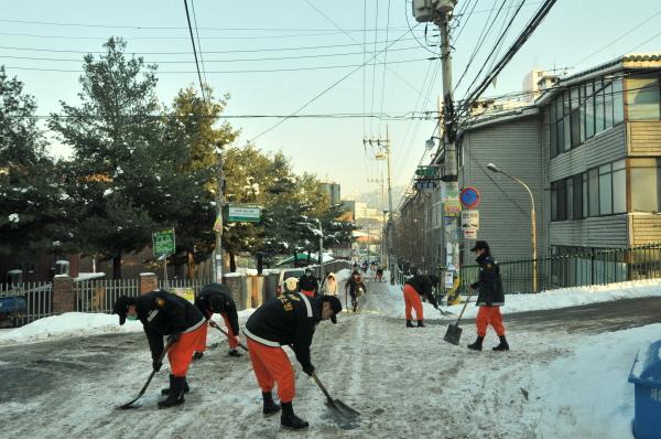 이때 제설차량은 큰 도로와 중심가를 제설기계로는 골목이나 작은 도로를 맡아서 제설 작업을 함
