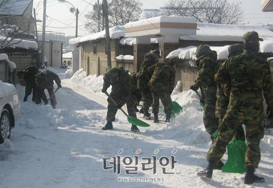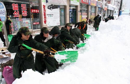 군인들을 동원해 아마추어적으로 제설작업을 하는 모습